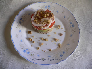 - Montaje: poner en un plato el aro de emplatar, colocar dentro un poco de quinua, encima una capa de aguacate, una capa de huevo duro, una capa de tomate y terminar con una capa de cebolleta.
